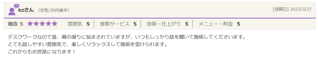 デスクワークなので首、肩の凝りに悩まされていますが、いつもしっかり話を聞いて施術してくださいます。