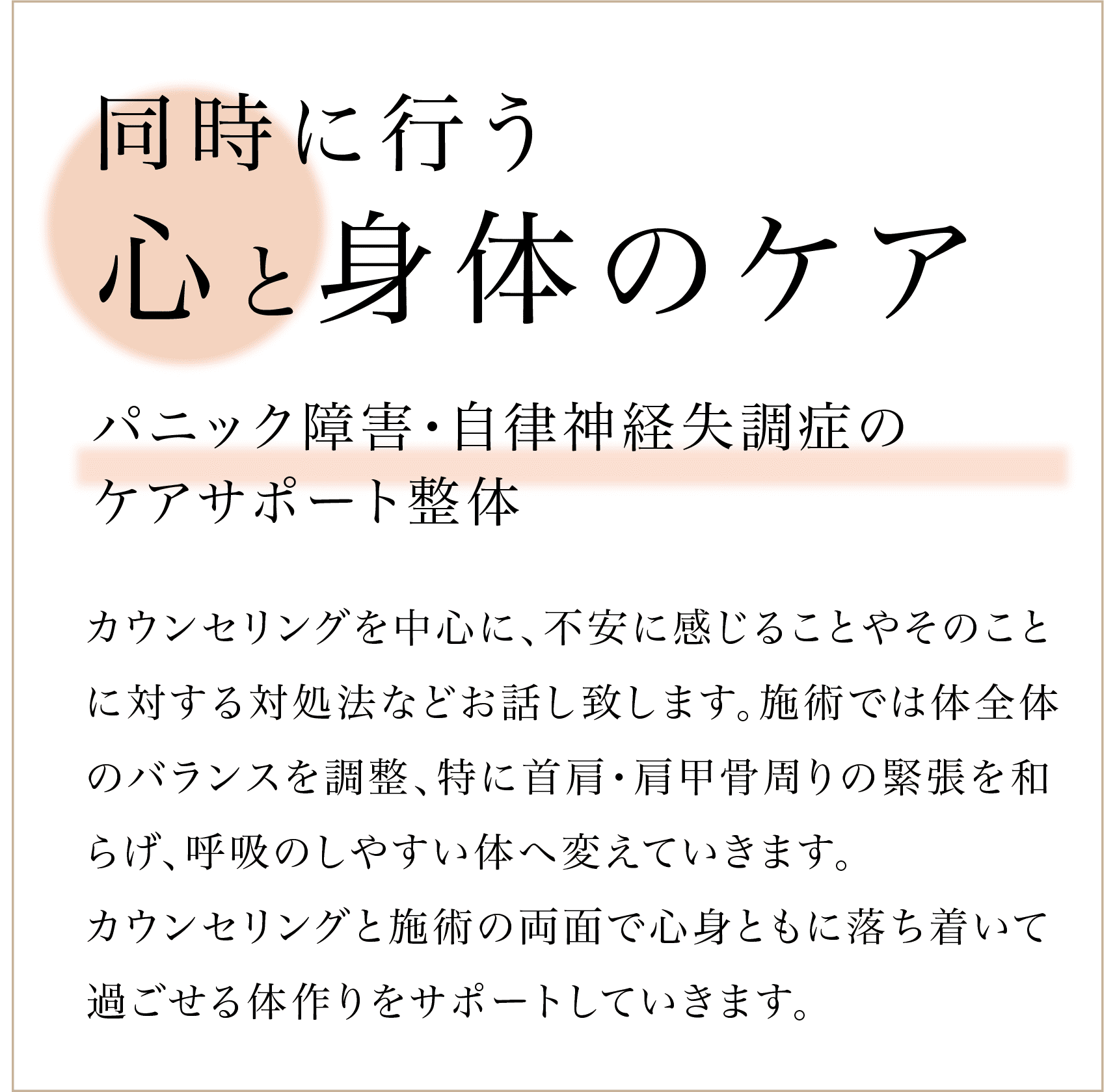 パニック障害でお悩みの方、自律神経の乱れからくる体の不調にお悩みの方。
